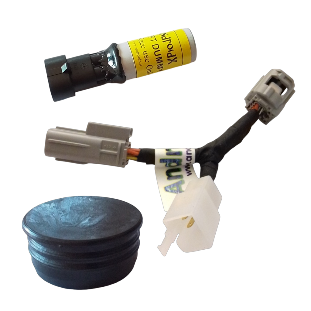The kit allows for RSV4 key lock removal and ensures continuous transponder recognition. It includes the Dummy Key, which simulates the key, wiring that replaces the removed key block (using the emergency button to power up the dashboard), and a cover to fill the hole on the steering plate.